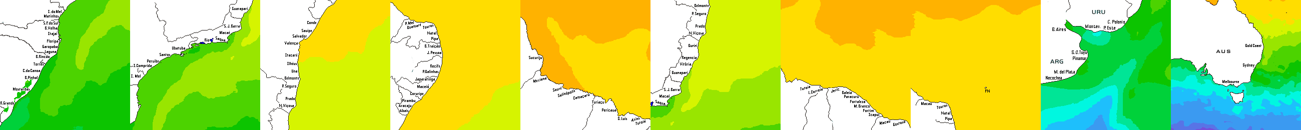 * Temperatura da superfície do mar perto da costa. Diferenças podem ocorrer dentro das baías e perto da foz dos rios, devido à influência das águas costeiras.