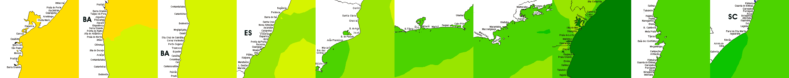 * Temperatura da superfície do mar perto da costa. Diferenças podem ocorrer dentro das baías e perto da foz dos rios, devido à influência das águas costeiras.