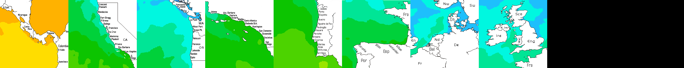 * Temperatura da superfície do mar perto da costa. Diferenças podem ocorrer dentro das baías e perto da foz dos rios, devido à influência das águas costeiras.