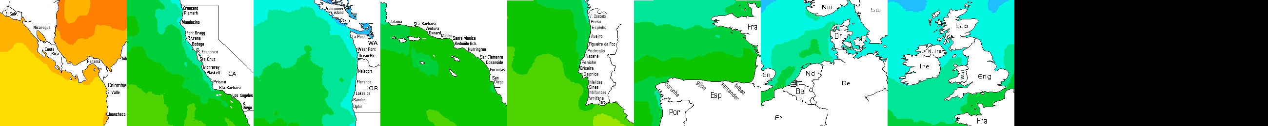 * Temperatura da superfície do mar perto da costa. Diferenças podem ocorrer dentro das baías e perto da foz dos rios, devido à influência das águas costeiras.
