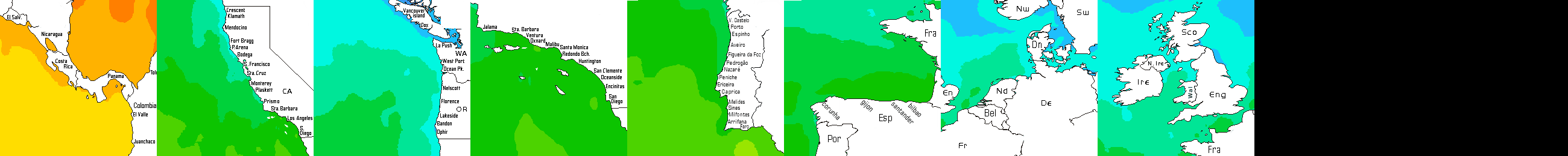 * Temperatura da superfície do mar perto da costa. Diferenças podem ocorrer dentro das baías e perto da foz dos rios, devido à influência das águas costeiras.