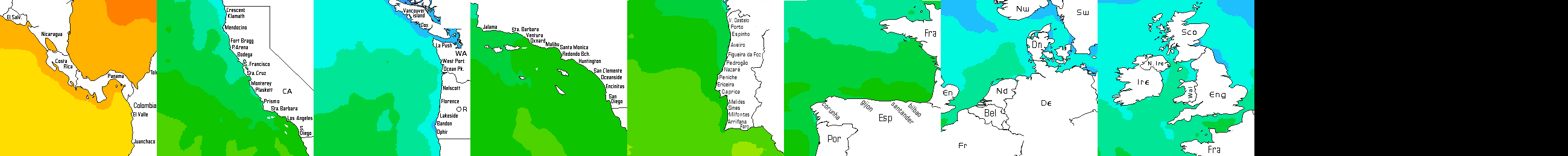 * Temperatura da superfície do mar perto da costa. Diferenças podem ocorrer dentro das baías e perto da foz dos rios, devido à influência das águas costeiras.